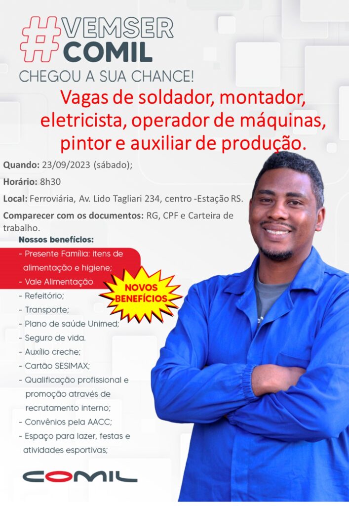 Participe do processo seletivo da empresa Comil neste sƔbado, na FerroviƔria, a partir das 8h e 30min.