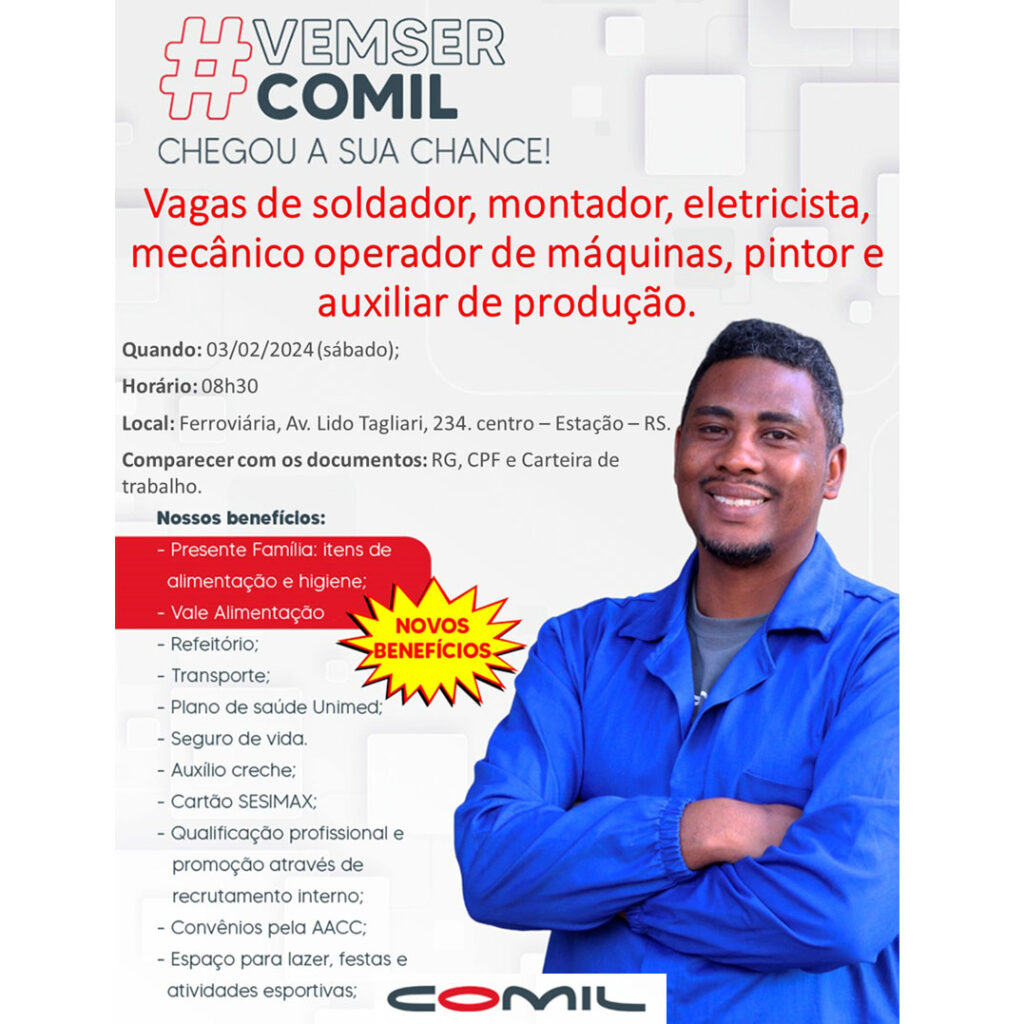 Participe do processo seletivo da empresa Comil neste sábado, na Ferroviária, a partir das 8h e 30min.