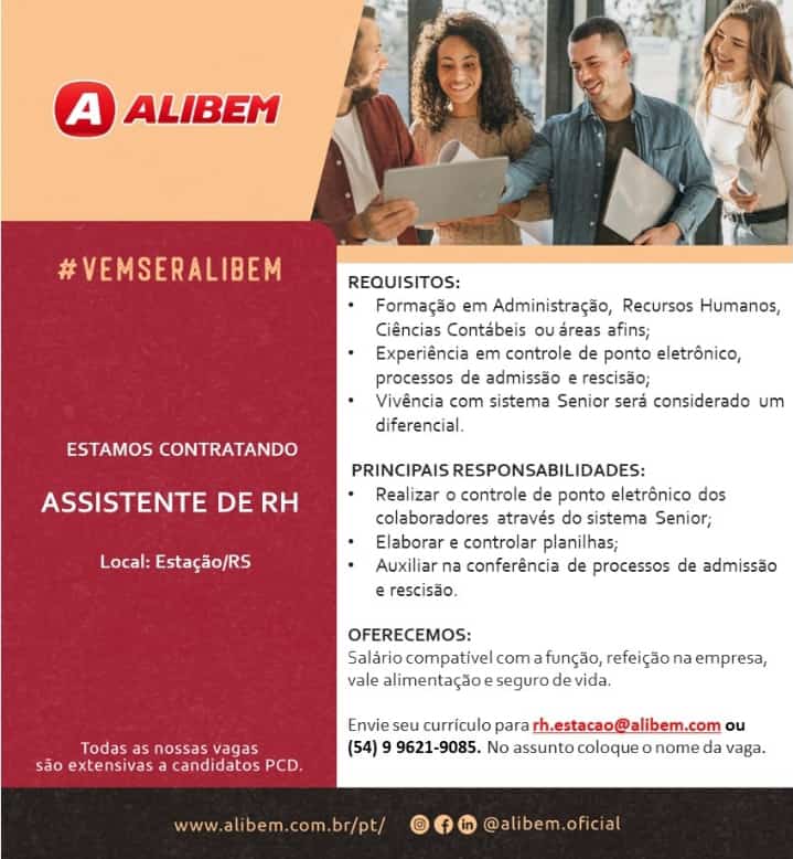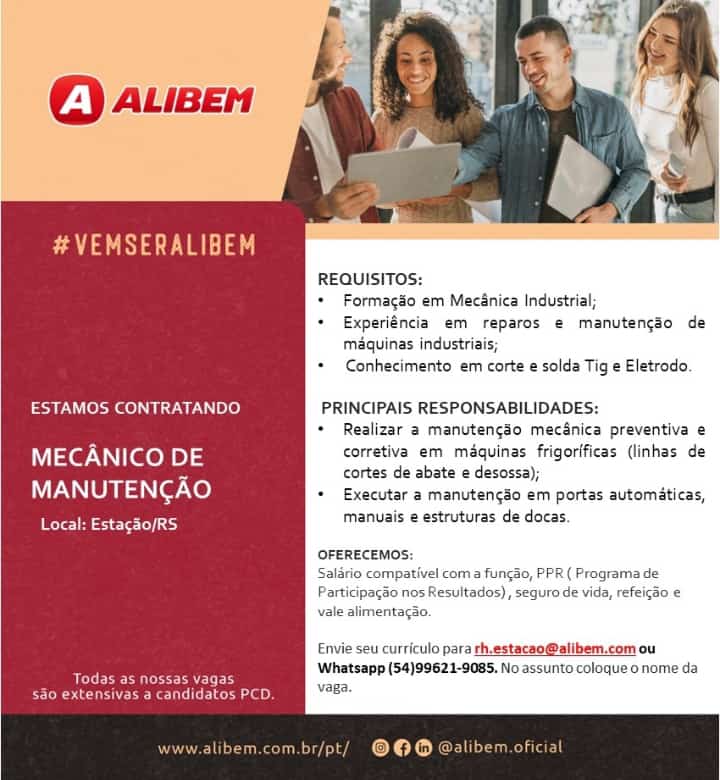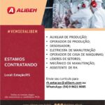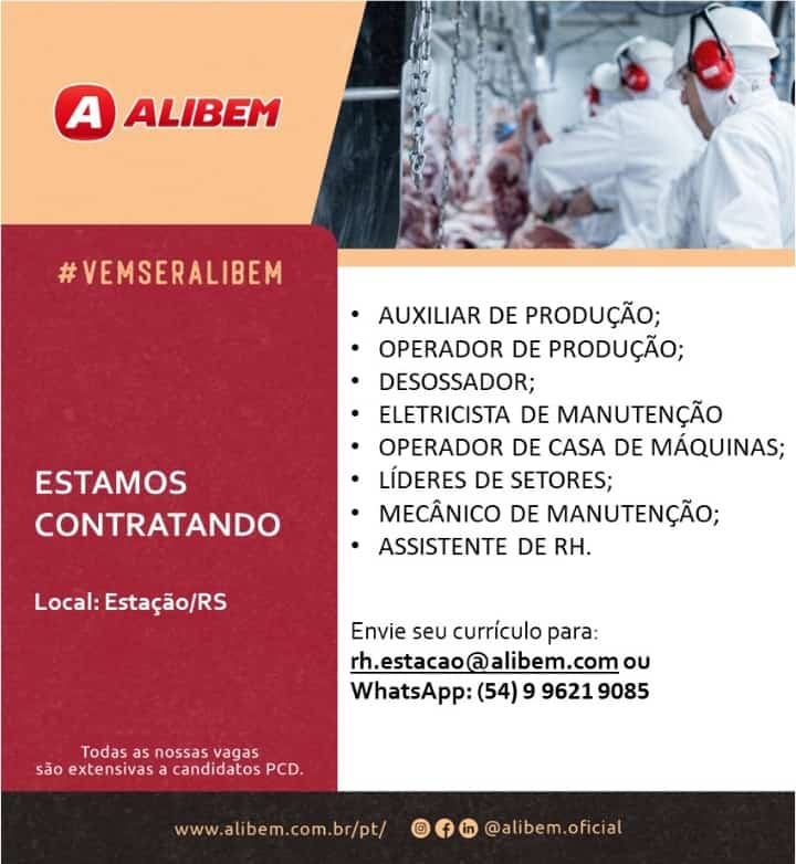 ALIBEM ALIMENTOS divulga vagas disponĆ­veis, envie seu currĆ­culo para rh.estacao@alibem.com ou pelo whats (54) 9 9621-9085.