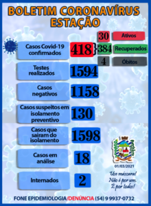 COVID-19: Segunda dose para idosos e profissionais de Saúde O município de Estação recebeu ontem (04), mais 110 unidades da 2ª dose da vacina contra Covid-19.Os idosos que receberam a 1ª dose no mês passado, a partir de hoje serão imunizados com a 2ª dose. Deste total de 110 doses, 100 unidades são para os idosos com 85 anos ou