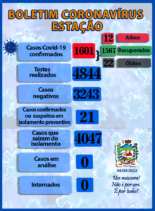 A Secretaria da Saúde do Município, juntamente com o Comitê Municipal Epidemiológico de Coronavírus, informa os dados atualizados. 02 CASOS NOVOS: 1 mulher entre 51 e 60 anos e 1 homem entre 61 e 70 anos. Reforçamos que continuem com os protocolos e usem máscara para evitar a contaminação!