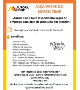AURORA COOP AVES disponibiliza vagas de emprego em Erechim! Atenção munícipes para a seleção! Dia 29 de ABRIL Local: CRAS Horário: 9h Maiores informações, entre em contato pelo telefone (54) 3520-3900.