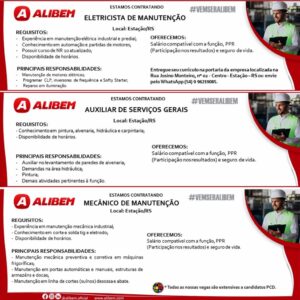 🗣 🗣 DIVULGA VAGAS ESTAÇÃO 🗣🗣 ALIBEM ALIMENTOS divulga as primeiras vagas disponíveis para: 📍 AUXILIAR DE SERVIÇOS GERAIS; 📍 MECÂNICO DE MANUTENÇÃO e 📍 ELETRICISTA DE MANUTENÇÃO. Entregue seu currículo na portaria da empresa localizada na Rua Josino Monteiro, nº 02 – Centro – ou envie pelo WhatsApp (54) 9 9621-9085.