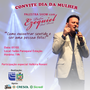 VOCÊ É NOSSA CONVIDADA ESPECIAL!!! Vamos comemorar juntas o Dia Internacional da Mulher celebrado mundialmente no dia 08 de março. A Gestão Municipal juntamente com a Emater e os apoiadores – ACE Automóvel Clube de Estação, Cresol e Sicredi – irão proporcionar um momento muito especial. Será na quinta-feira: dia 07/03,no Salão Paroquial de Estação,a partir das 19h. Palestra Show com Pe