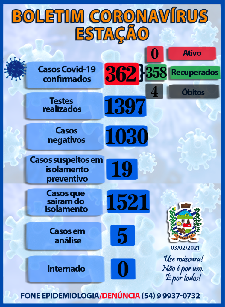 A Secretaria da Saúde do Município, juntamente com o Comitê Municipal Epidemiológico de Coronavírus, informa os dados atualizados desta quarta-feira (03).