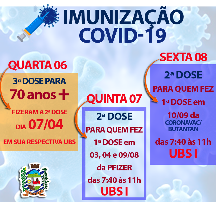 A Secretaria da Saúde de Estação informa que a imunização com a terceira dose conta a COVID-19, acontecerá nesta semana para idosos com 70 anos +, em sua respectiva UBS.