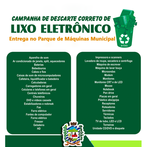 A Secretaria Municipal de Agricultura e Meio Ambiente informa que realizará novamente a campanha de coleta de resíduos eletrônicos.