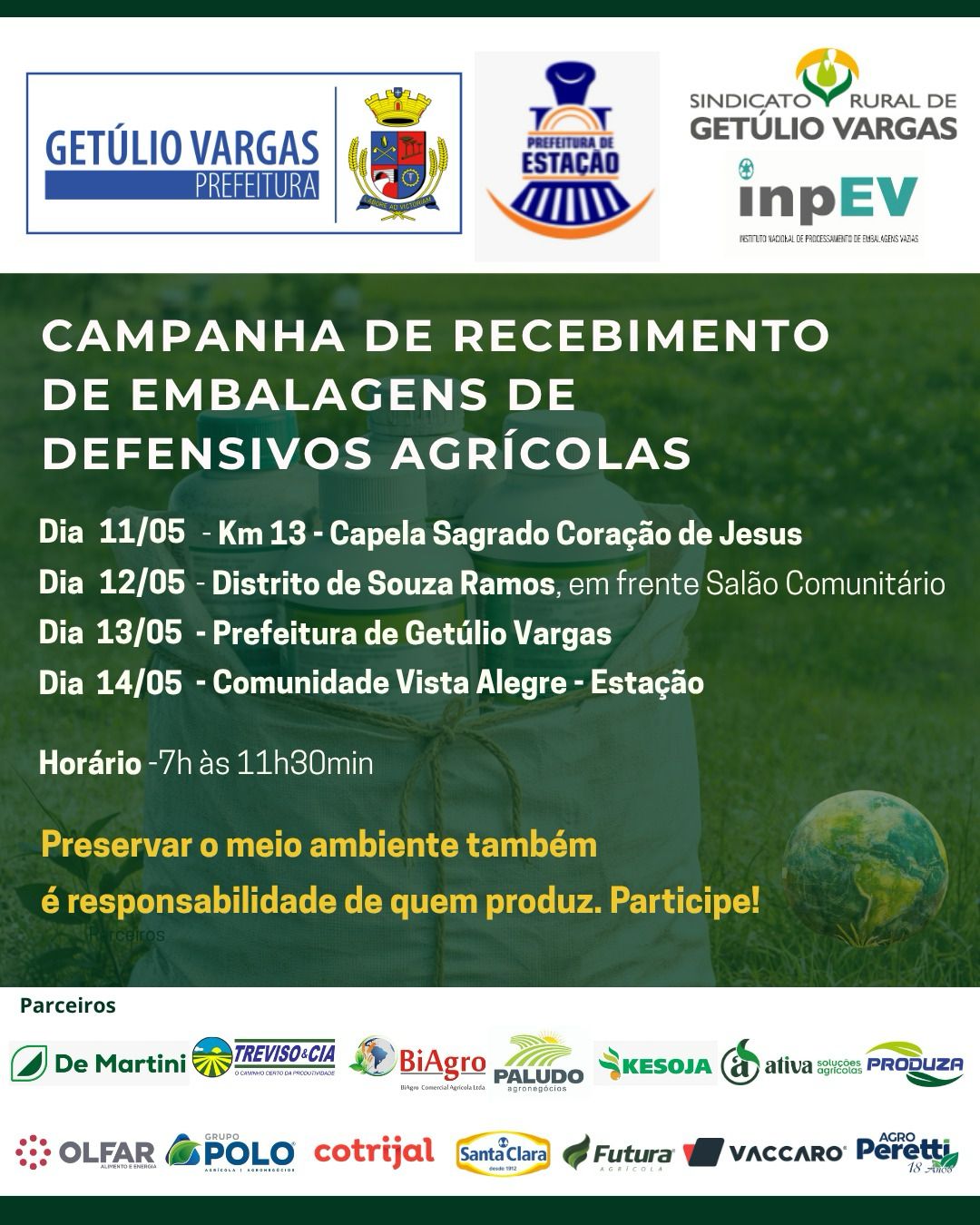 A parceria da Administração Municipal de Estação, Getúlio Vargas, Sindicato Rural, Inpev (Instituto Nacional de Processamento de Embalagens Vazias) e empresas do setor, busca garantir o descarte ambientalmente correto de embalagens, contribuindo para a preservação do meio ambiente e da saúde pública, evitando assim contaminações do solo, da água e do ar, e cumprindo a legislação ambiental vigente.