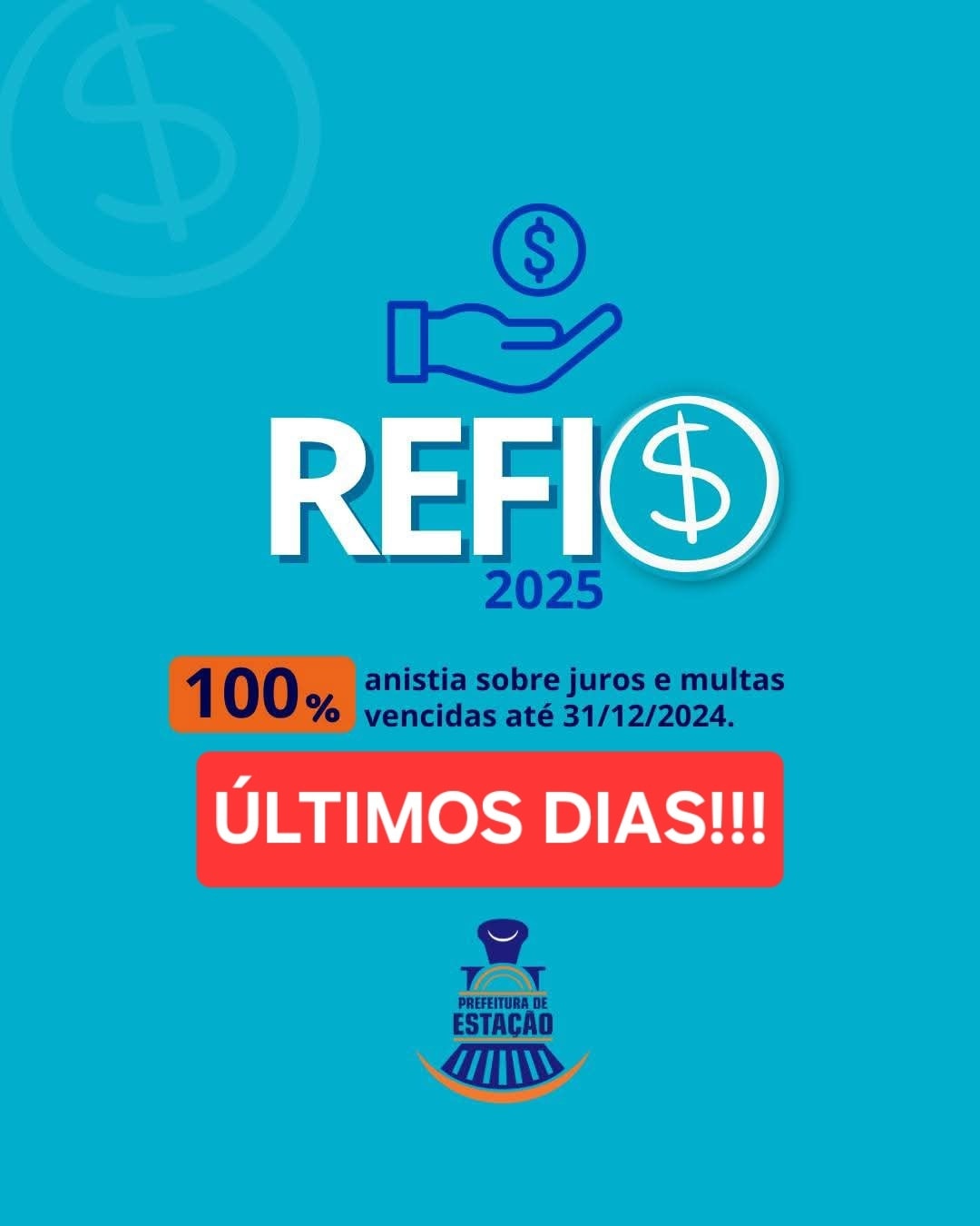 A Administração Municipal de Estação informa que o Programa de Recuperação Fiscal – REFIS 2025, vai até o fim do mês e é uma chance única para você regularizar seus débitos com o município!