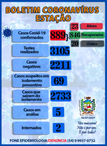 A Secretaria da Saúde do Município, juntamente com o Comitê Municipal Epidemiológico de Coronavírus, informa os dados atualizados desta sexta-feira (02).   Casos novos: 04 01 homem entre 21 e 30 anos; 01 mulher entre 31 e 40 anos; 01 mulher entre 61 e 70 anos; e 01 mulher internada acima dos 70 anos.   🩺 Internações hospitalares: Ocupação