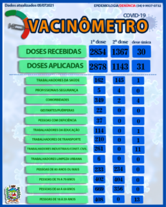 Secretaria da Saúde e Comitê Epidemiológico informam dados da vacinação contra Covid-19. Os dados referente as doses recebidas são a informação que vem na nota enviada pelo Ministério da Saúde, contudo há diferença entre doses aplicadas e doses reais recebidas. Isto ocorre pelo fato de os frascos da Vacina Astrazeneca saírem 10 doses/11 doses. E em contrapartida, alguns frascos da