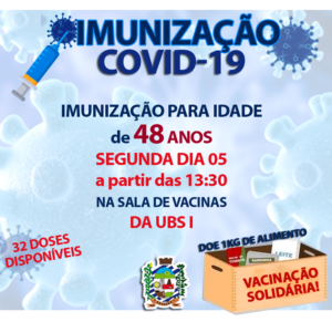 A Secretaria da Saúde de Estação informa que a imunização contra a COVID-19 acontecerá hoje, segunda-feira pela parte da tarde –   👉 para a idade de 48 anos, a partir das 13:30h 🕗 💉 na sala de VACINAS da UBS I. são 32 doses disponíveis 👈 Salientando que a vacinação irá ocorrer enquanto houverem doses disponíveis. Caso tenha